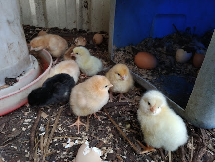 I have 8 new baby chicks !! 11 fertile eggs - one was rolled out by the mother hen at the halfway point, one more egg didn't hatch (yet!), and one hatched but the chick was left dead outside the first night :( I guess the mother rejected it for some reason.